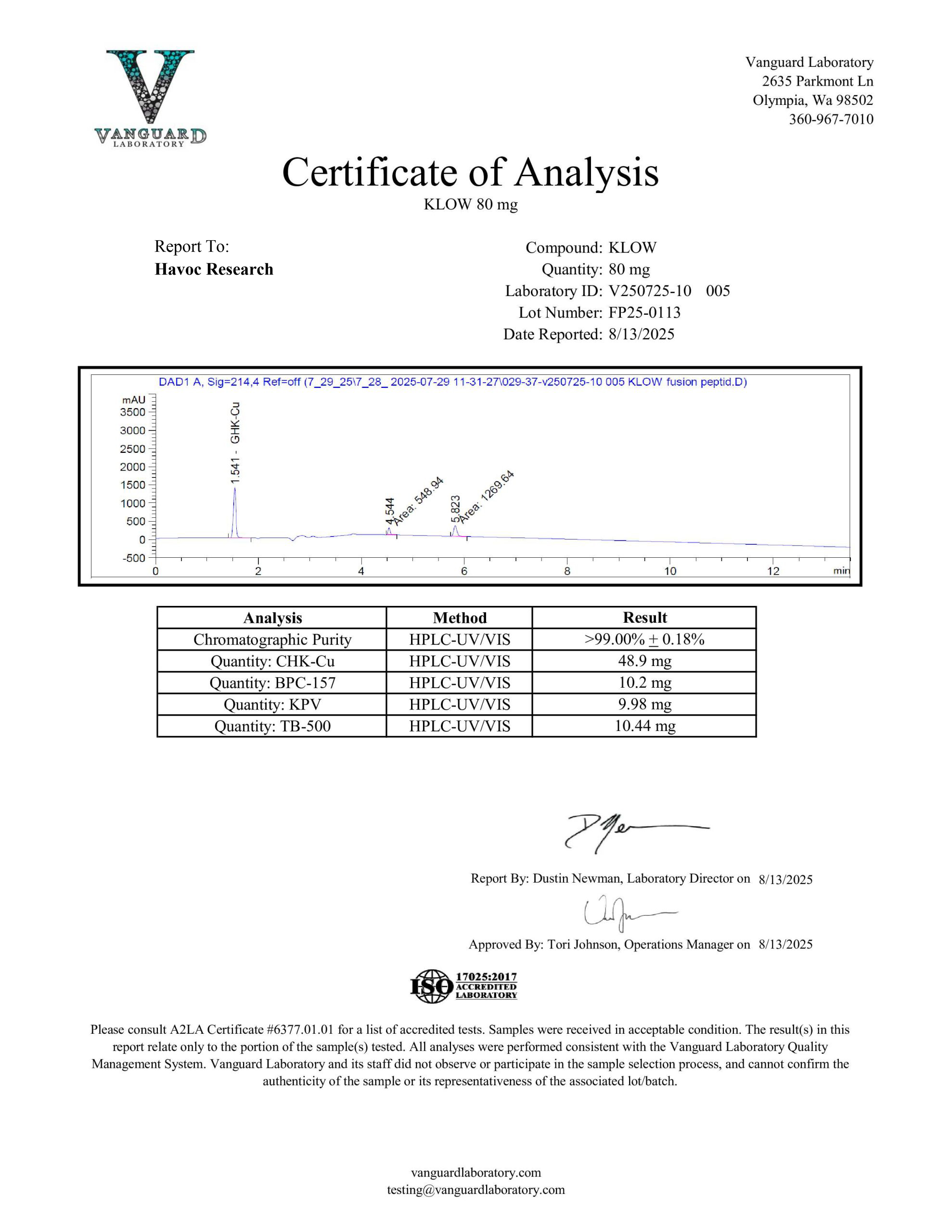 KLOW is now available. Havoc Research reviews every batch carefully because we ensure that each product is properly produced to include proper appearance and high purity. Each vial contains the following: GHK-cu – 50mg, BPC-157 – 10mg, TB-500 – 10mg and KPV – 10mg for a total milligrams per vial of 80mg.